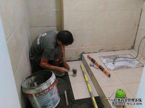 用水泥砂浆将蹲便器固定在水平表面上,然后将其平稳牢固地固定,然后再将浴室地砖放在水泥表面上。