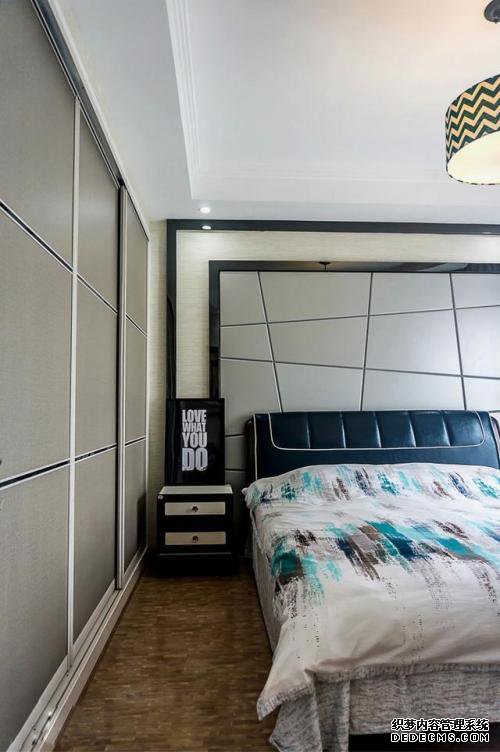 主卧室的装饰性设计非常大胆,不规则的壁图案设计提供了一个视觉上美观的视觉效果,重新安装灯的设计和内部的肋骨在家里提供一个温馨的氛围。颜色比较安静,床头柜上有两盏灯,它是卧室的主要照明。