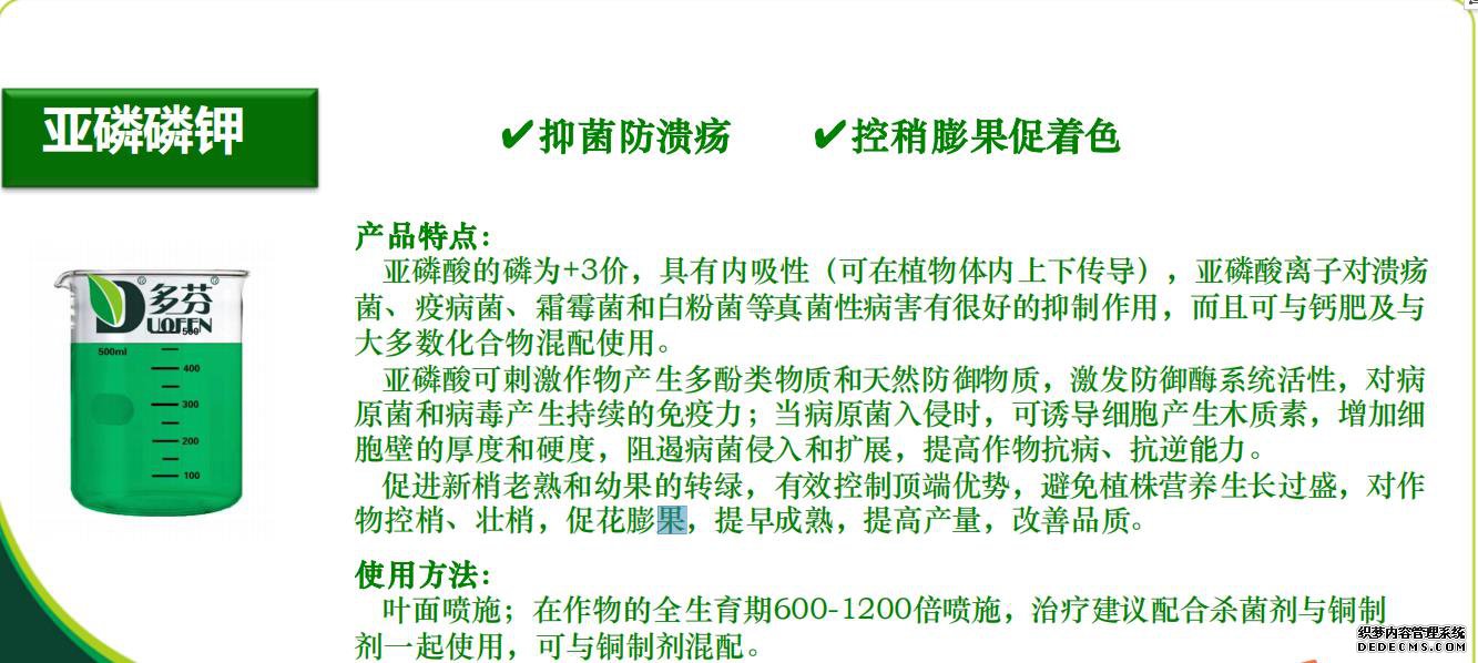 亚磷酸钾具有1,叶面喷雾,吸收快,可以快速添加磷钾肥。